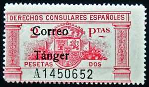 1938 TANGER Ed#144** DOS PESETAS DERECHOS CONSULARES , vendido en Agosto 2011, ¡Por 2.5 EUR!