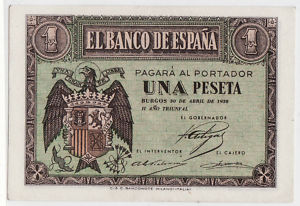 BILLETE UNA PESETA . BANCO DE ESPAÑA DE BURGOS 1938, vendido en Abril 2011, ¡Por 21.5 EUR!
