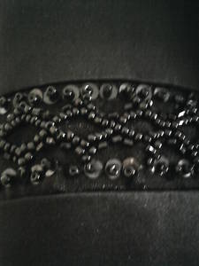 The dress strapless and fitted around the bust, there is a section of beading running under the bustline. The colour is black and the material has a sheen to it (like satin) and is quite heavy. There is a side (hidden) zip on the left hand side of the dress. The back of the dress has a "tail" of material which flows as you walk, this makes it quite special and you will look a million dollars.
