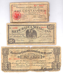 MEXICO THREE NOTES.25 CENTAVOS FRANCISCO VILLA VG,10 CENTAVOS F,AND 1 PESO FAIR,WITH LARGE INTERNAL SPLITS AND SMALL PIECES MISSING AT THE EDGES