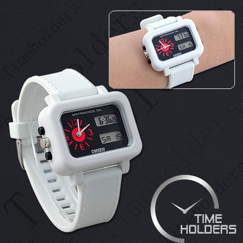 Movement quartze& digital Case color white Case Back material Stainless Steel Case Diameter(cm) 4.5cm x 3.2cm Case thickness(cm) 1.3cm Band material rubber Band color white Band length(cm) 24.5cm (including the dial) Band width(cm) 2.2cm Band Adjustable yes